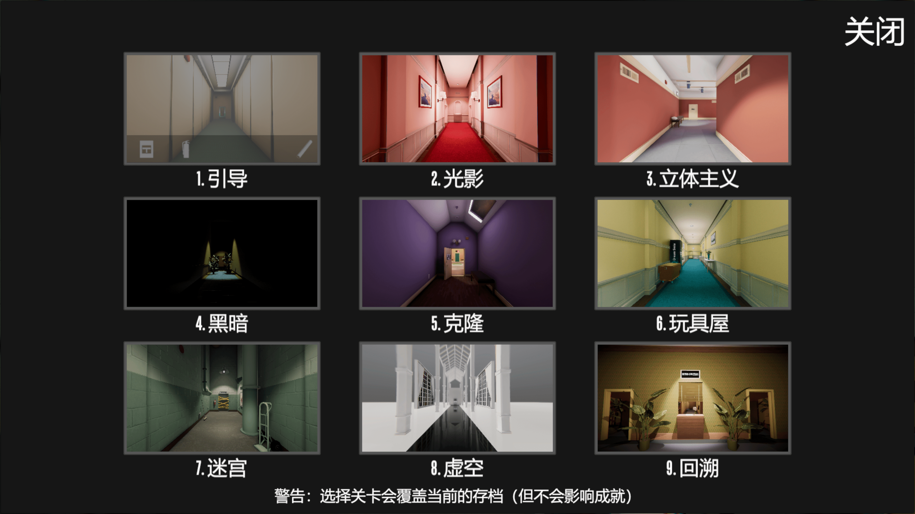 其次,游戏加入了很多没有必要的,带有恐怖暗示的元素。比如游戏中经常出现高空坠落的场景,有些甚至是突然发生的。而且纯色干净的墙上无缘无故会有红色的油漆!恐怖的设计在“黑暗”这一大关卡中尤其明显,这里有闪烁的灯,红色的光,杂乱的物品。我在玩的时候真的很想跳过这些关卡!我不明白为什么要这样设计,事后来看这些设计也完全没有增加游戏的可玩性和关卡的趣味性。本来游戏的定位是休闲娱乐向的解谜,加入这些元素非常不合时宜。更不合理的是,出现这些元素的时候,还放着舒缓的音乐。倒不是说这些设计不好,只是用错了地方,如果这是一款恐怖探险游戏(比如具有“后室”后室是一个由随机产生、大小不一的房间组成的办公室迷宫。其具体表现形式为“阴森、无人居住空间的图像”。风格游戏),这些设计就很加分。